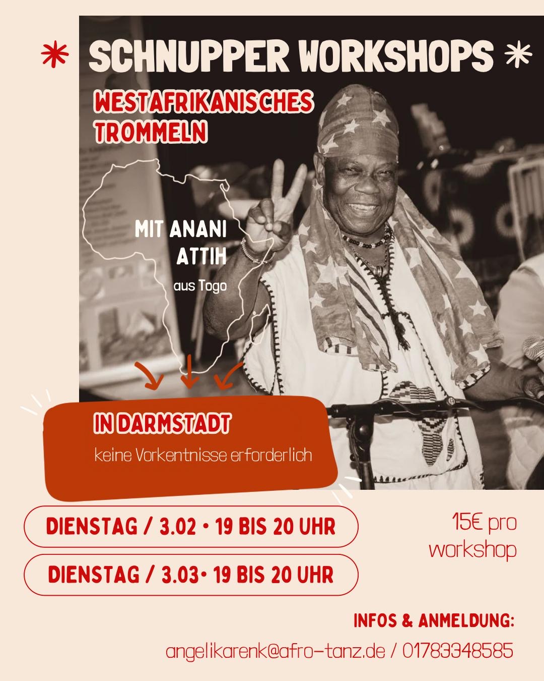 mit Anani Attih (Togo) Kosten: 15€ Ort: Heinrich-Hoffmann-Schule (gegenüber der Victoriaschule, Parkmöglichkeit: Schulhof der Victoriaschule) |