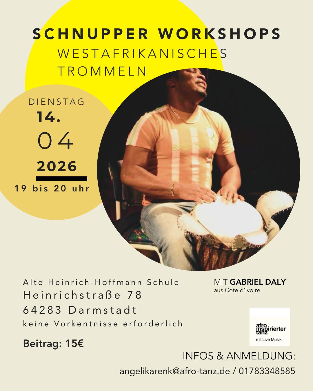 mit Gabriel Daly (Elfenbeinküste) Kosten: 15€ Ort: Alte Heinrich-Hoffmann-Schule (gegenüber der Victoriaschule, Parkmöglichkeit: Schulhof der Victoriaschule) |
